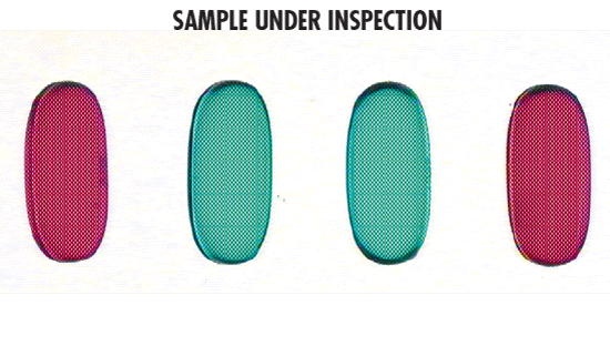 Monochrome cameras cannot inherently differentiate different colors. However, the addition of a color filter greatly increases the contrast between objects. A good rule of thumb is that a given color filter will lighten objects of the same color, while darkening objects of opposing colors. Consider an example where two red and two green pills are imaged with a monochrome camera. Figures 9a - 9d show actual images of a sample under inspection and various images using color filters. It is clear to see that with no filter (Figure 9b), the monochrome camera cannot distinguish between red and green. It would be impossible to inspect these pills on a factory floor. On the other hand, when a red filter is used (Figure 9c), objects of its opposing color (i.e. the green pills) appear gray due to increased image contrast and can be easily discerned from the red pills. Conversely, when a green filter is used (Figure 9d), the red pills appear gray.