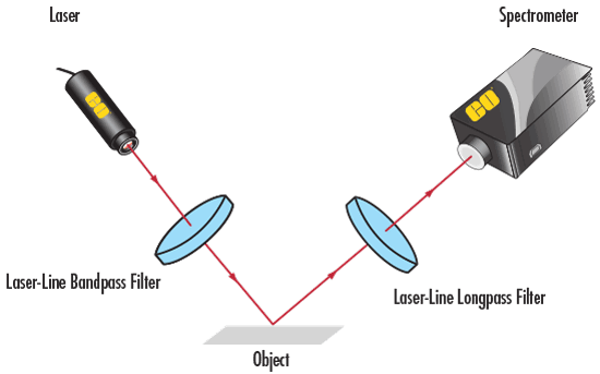 The results in a Raman spectroscopy application can be greatly improved by the use of a few select filters: laser line bandpass, rugate notch, or laser line longpass. To achieve the best results, use filters with bandwidths as narrow as 1.2nm and optical densities of OD 6.0. The laser line bandpass filter is placed in the optical path between the laser and the sample. This ensures that any external ambient light is blocked and only the laser line wavelength is passed. After the light is incident on the sample, it is shifted due to Raman scattering and contains many low intensity modes or signals. Therefore, it becomes very important to block the high intensity laser light through the use of a notch filter centered as close as possible to the laser wavelength. If Raman excitation modes occur very close to the laser line, then a laser line long pass filter can be used as an effective alternative. Figure 10 illustrates a typical Raman spectroscopy setup.