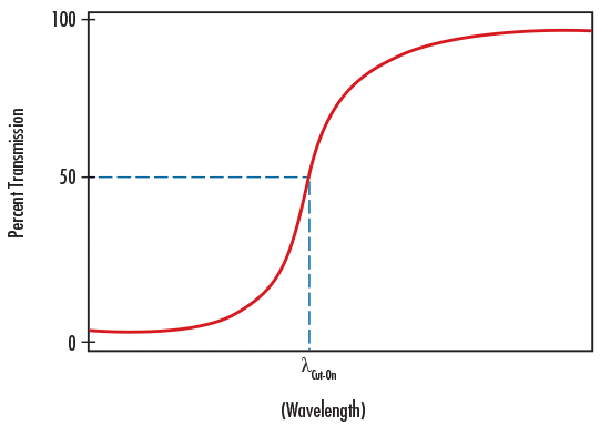 Cut-On Wavelength is a term used to denote the wavelength at which the transmission increases to 50% throughput in a longpass filter. Cut-on wavelength is indicated by λcut-on in Figure 5.