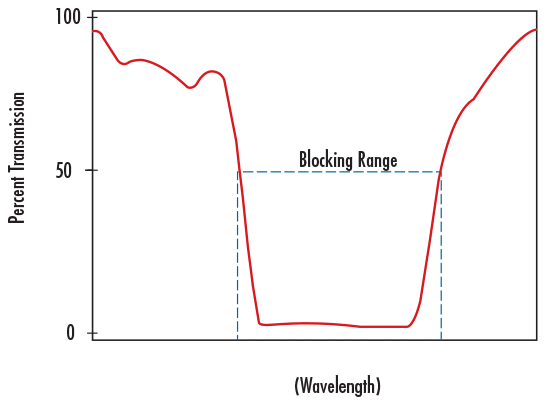 Blocking Range is a wavelength interval used to denote a spectral region of energy that is attenuated by the filter (Figure 2). The degree of its blocking is typically specified in terms of optical density.