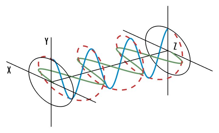- Circular polarization: the electric field of the light consists of two linear components that are perpendicular to each other, equal in amplitude, but have a phase difference of π/2. The resulting electric field rotates in a circle around the direction of propagation and, depending on the rotation direction, is called left- or right-hand circularly polarized light (Figure 2).