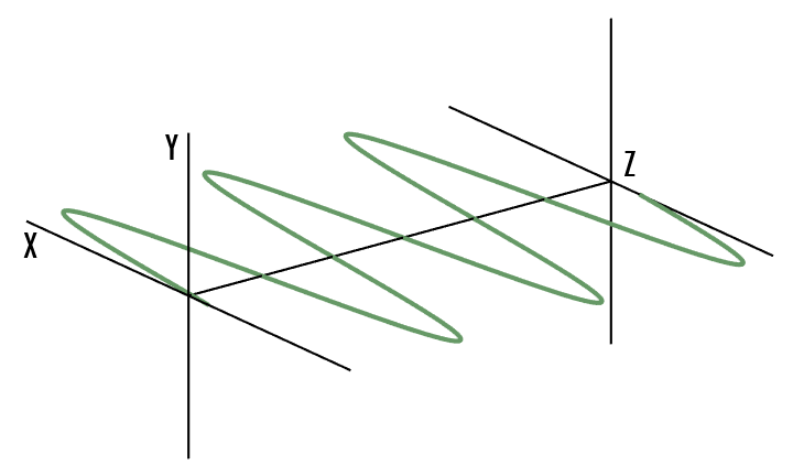 Figure 1: The electric field of linearly polarized light is confined to the y-z plane (left) and the x-z plane (right), along the direction of propagation.