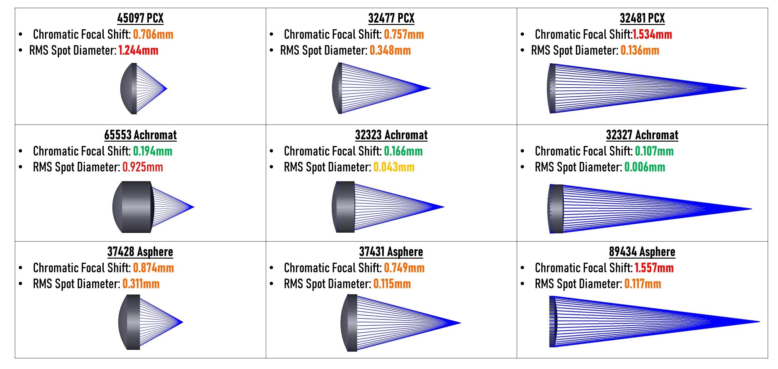 While none of the selected lenses meet the diffraction limit, it is certainly possible to achieve such performance for multiple wavelengths. For applications where diffraction-limited performance is required, see Edmund Optics’ best form aspheric lenses, aspherized achromatic lenses, or contact us for custom options!