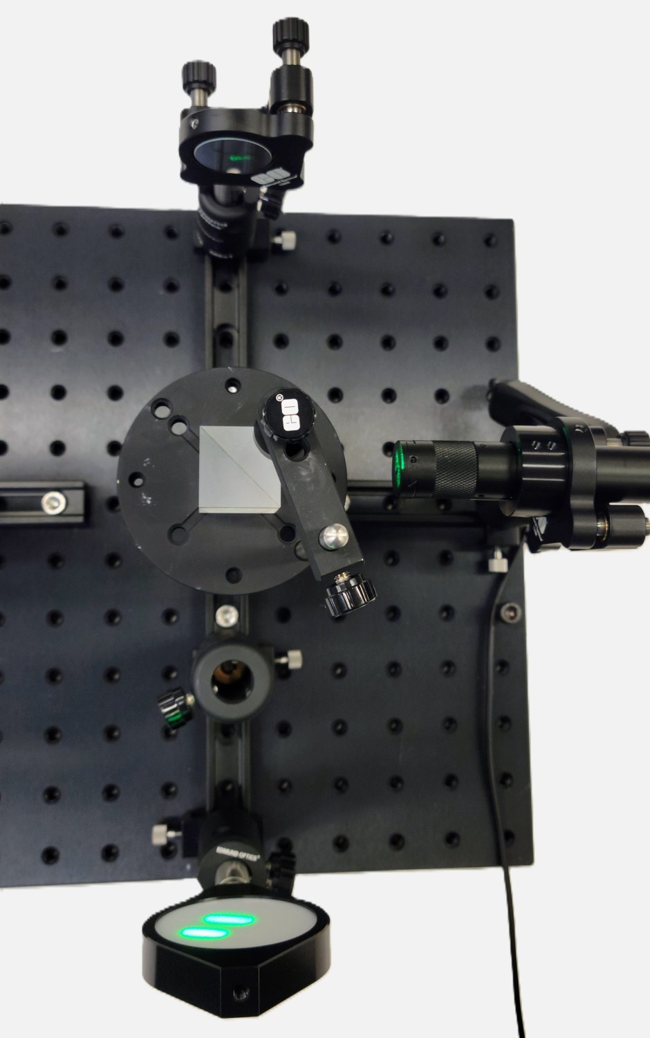 Now you have to assemble the cube beamsplitter mount. The Prism Mount with stock number 53-030 from Edmund Optics® requires a 1/4-20 Thread Adapter in order to be mounted to the post (see Figure 9). Be sure to use Fingercots when handling the TECHSPEC® Beamsplitter Cube to avoid dirt and fingerprints.