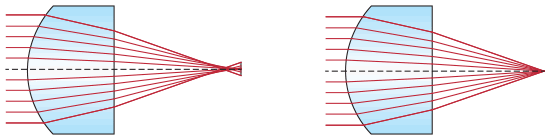 Aspheric lenses are used to reduce the number of lenses in a design, simplify assembly and minimize stray light, eliminate spherical aberration, and improve resolution and system performance. They correct for spherical and off-axis aberrations. A single aspheric lens offers the same amount of spherical aberration correction that two or more spherical lenses can accomplish. Aspheric lenses, by their very nature, are without the spherical aberration that is inherent in traditional plano-convex and double-convex spherical lenses. In addition to spherical aberration correction, aspheric lenses are very powerful in correcting off-axis/ field dependent aberrations such as field curvature, astigmatism, and distortion. Because of this, complicated ten element designs can be reduced to relatively simple four or five element designs.