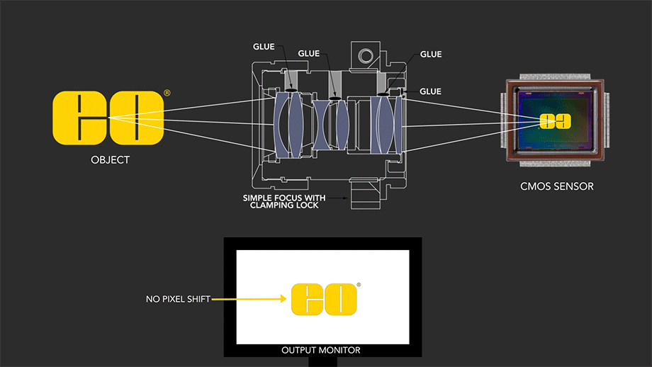 In Industrial Ruggedization, lens mechanics are simplified by replacing the adjustable iris with a fixed aperture stop and replacing the non-rotating double threaded barrel with a simple single thread and a rigid locking mechanism, such as a clamp, nut, or set screws. This reduction of moving parts decreases the cost of the lens and adds additional stability compared to standard imaging lenses, making it less likely that the focus of the lens will be affected by weak shocks and vibrations. However, excessively strong shocks and vibrations may still decenter the individual optics inside the lens and cause pixel shift - meaning that objects are mapped to the incorrect location on the image sensor (see Figure 1 and Figure 2).