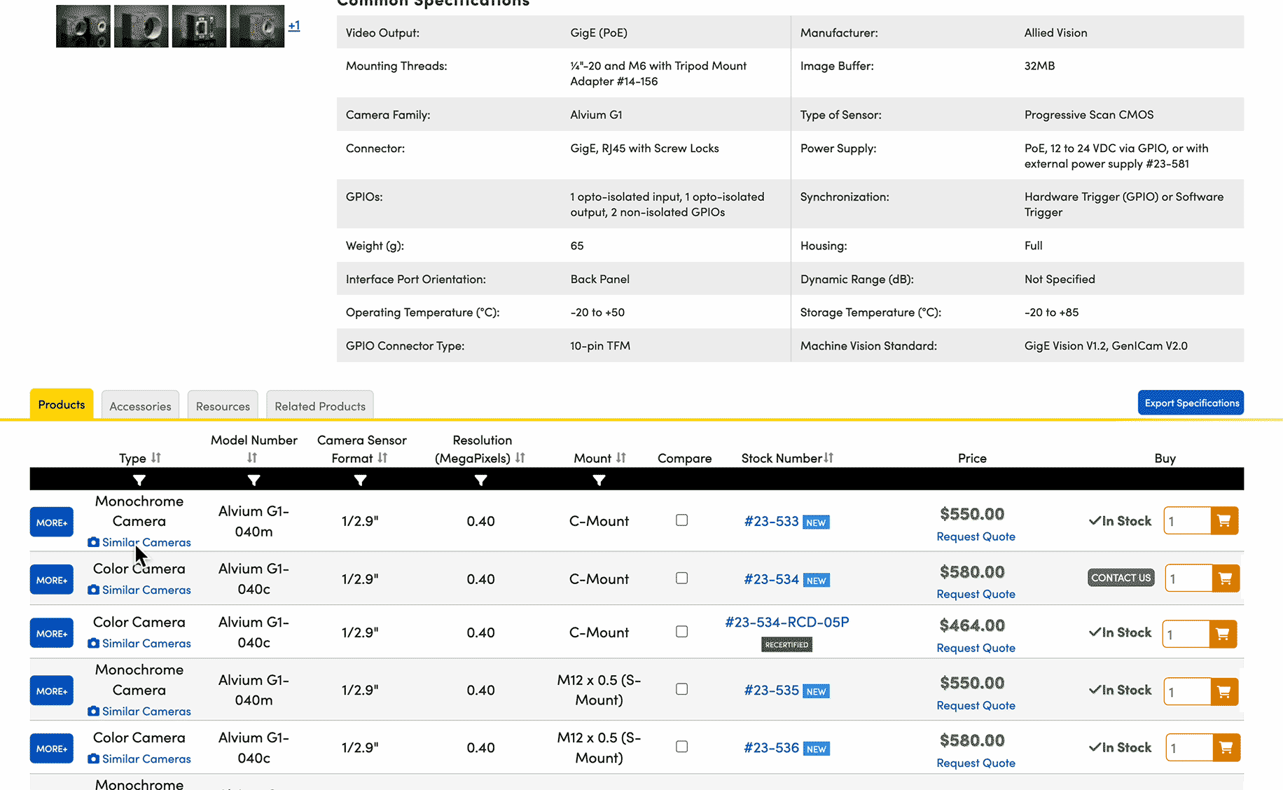 Find equivalent camera options with the same sensor, lens mount, and data connector. Quickly see which products